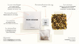 Vous êtes les artistes, nous sommes les artisans ! Grâce à notre simulateur en ligne, personnalisez vos sachets de thé en choisissant vos saveurs, vos couleurs… bref, tout ce que vous souhaitez ! Vous pouvez même ajouter une photo de vous, de votre animal préféré… Votre seule limite : votre imagination ! :)
